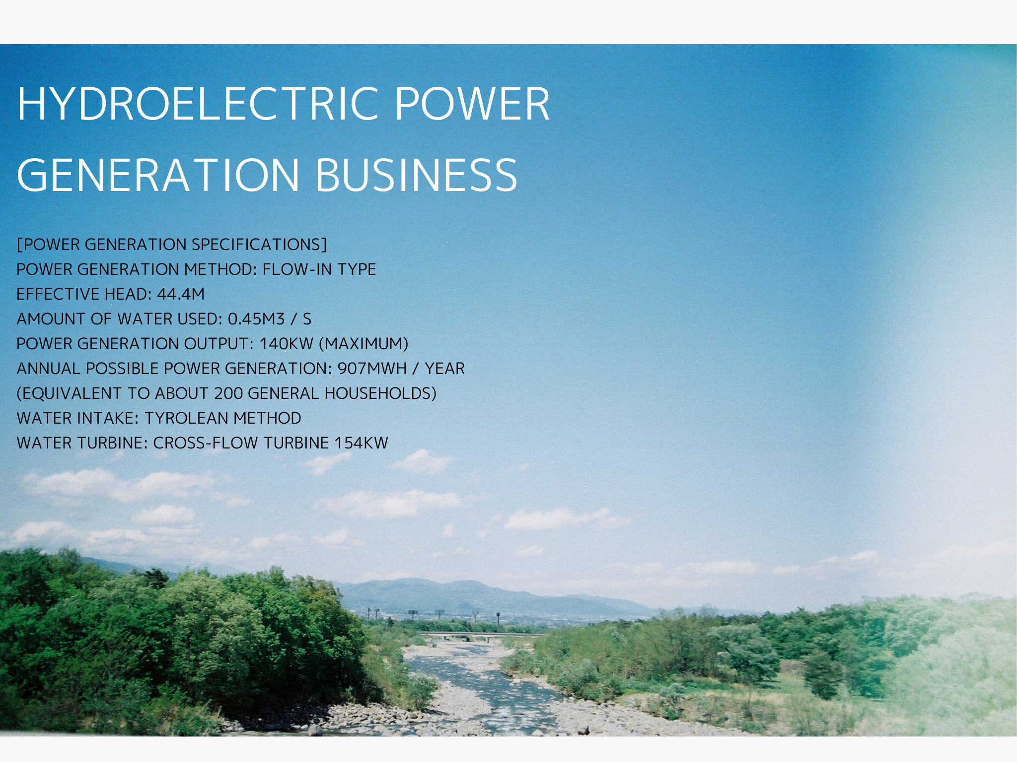 【 発 電 諸 元 】 発電方式:流れ込み式 有効落差:44.4m 使用水量:0.45m3/S 発電出力:140kW(最大) 年間可能発電電力量:907MWh/年 (一般世帯約200世帯相当) 取 水 口:チロリアン方式 水 車:クロスフロー水車 154kW
